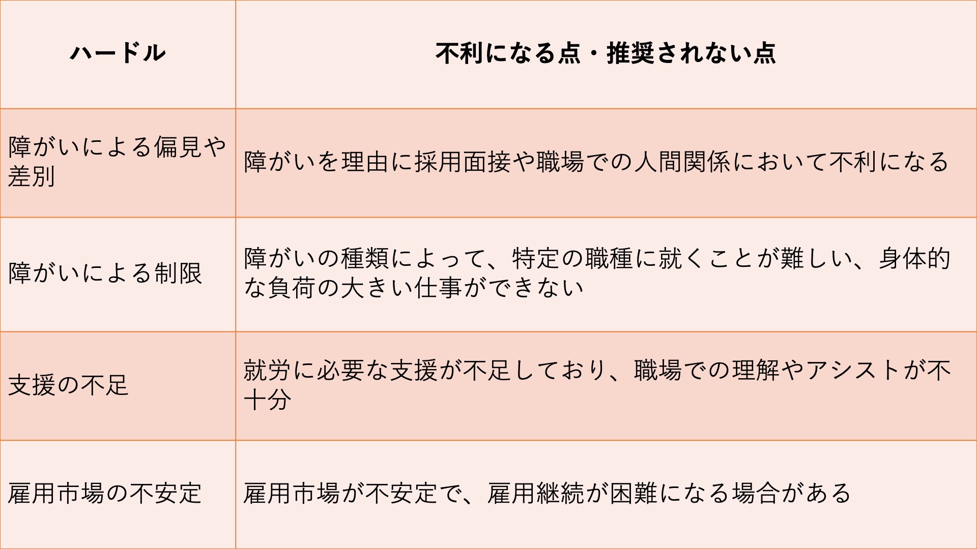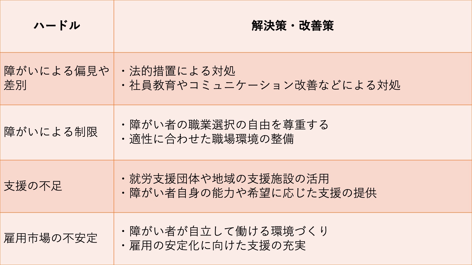 これらの要因によって、障がい者の就労が困難になることがあります。障がい者雇用の推進や、障がい者自身が積極的に就労に取り組むことが求められます。