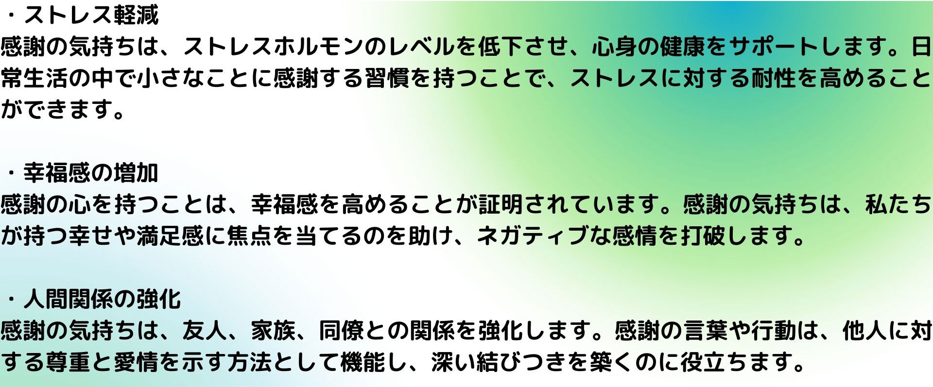 感謝の心を持つことは、幸福感を高める重要な要素です。感謝の気持ちは、私たちのポジティブな感情を刺激し、ストレスや不安を軽減する助けになります。感謝の心を持つことは、次の点で特に効果的です。