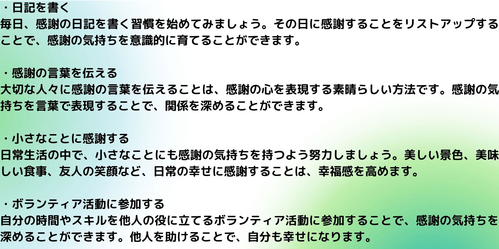 感謝の心を持つことは、日常生活に取り入れることができる簡単な方法がたくさんあります。以下は、感謝の心を実践するためのいくつかの方法です。