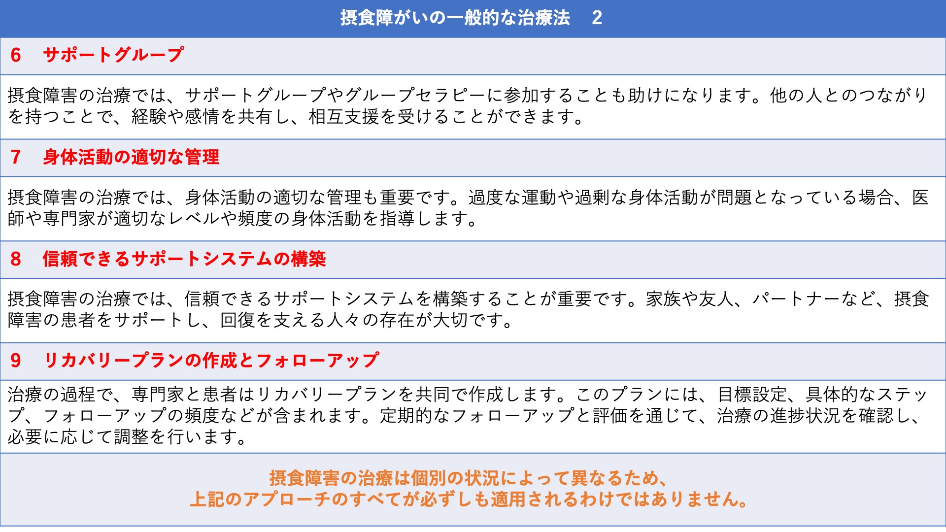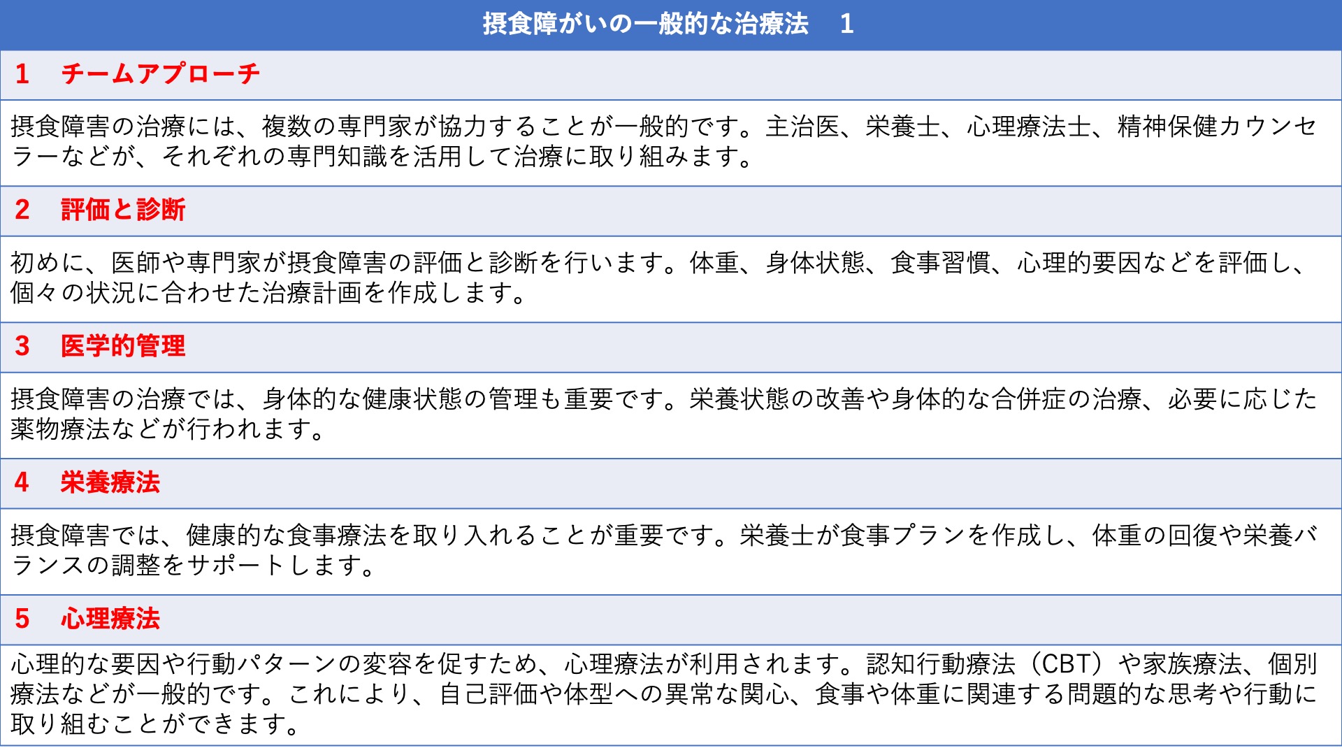 摂食障害の治療は、専門家のサポートと継続的なケアが重要です。以下に、一般的な治療方法やアプローチのいくつかを説明しますが、個々の状況によって異なる場合がありますので、医師や専門家の指示に従うことが重要です。