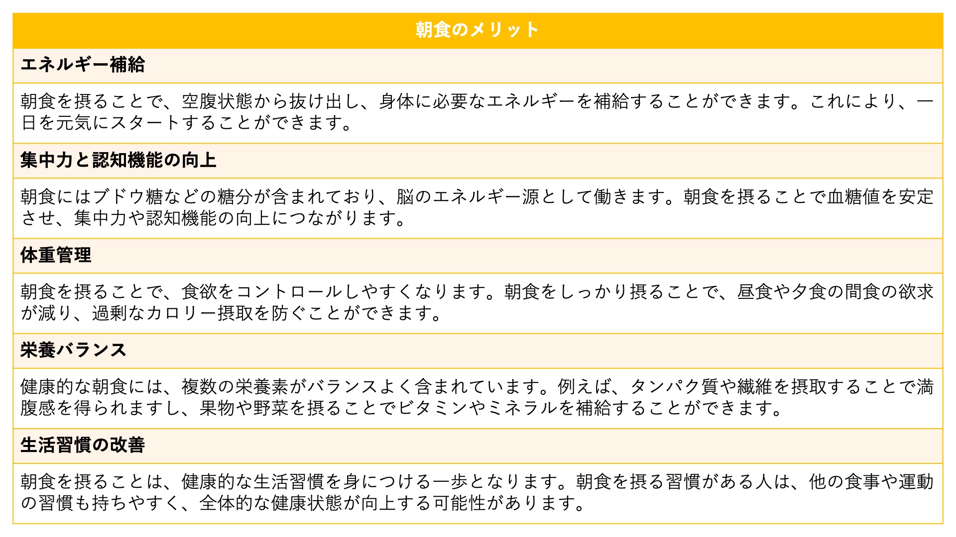 メリットからもわかるように、朝食は健康的な生活を送るために非常に重要です。忙しい朝でも、時間を作って栄養価の高い食事を摂ることを心掛けましょう。