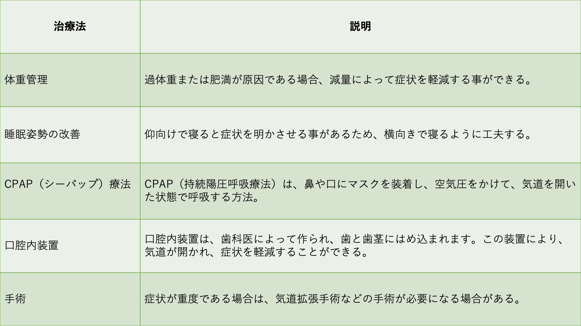 睡眠時無呼吸症候群の治療は、症状の重症度に応じて異なる場合があります。以下は、いくつかの一般的な治療法です。