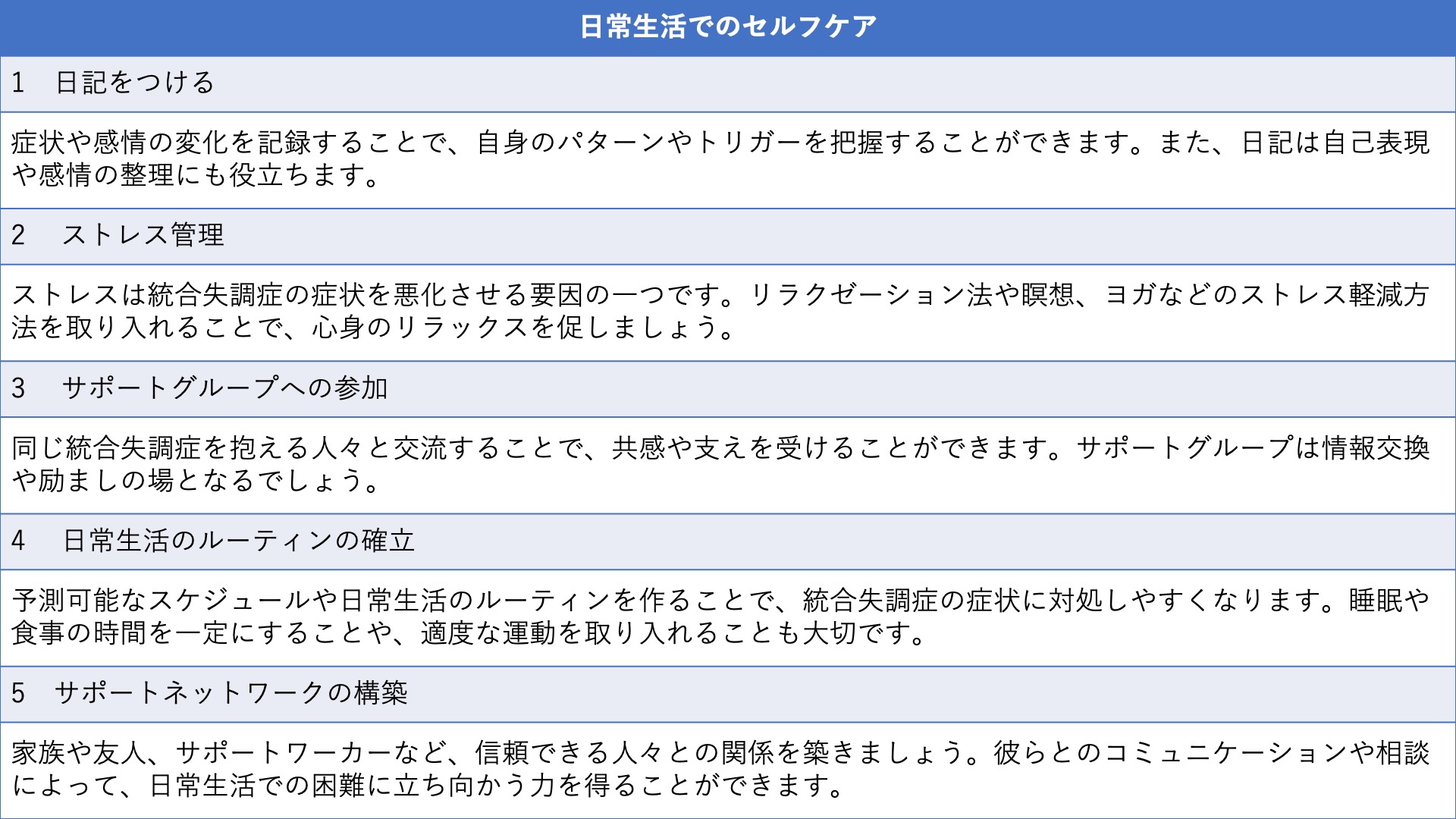 統合失調症は長期的な治療とサポートを必要とする疾患ですが、適切なケアを受けながら、充実した生活を送ることが可能です。自身の症状やニーズを理解し、専門家の助言を受けながら、前向きなアプローチで統合失調症と向き合いましょう。最も重要なことは、自分自身を責めずに、セルフケアと自己受容を大切にすることです。