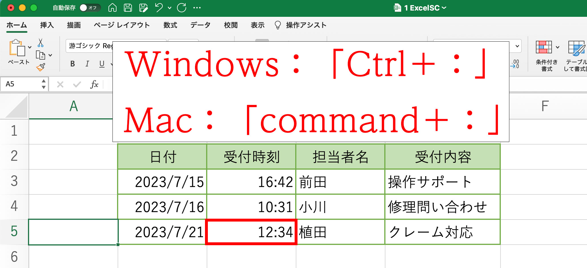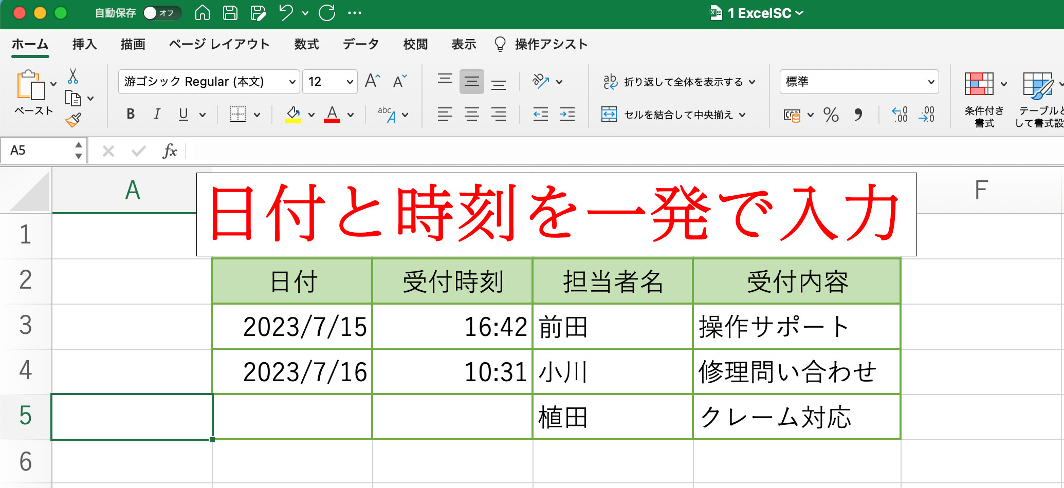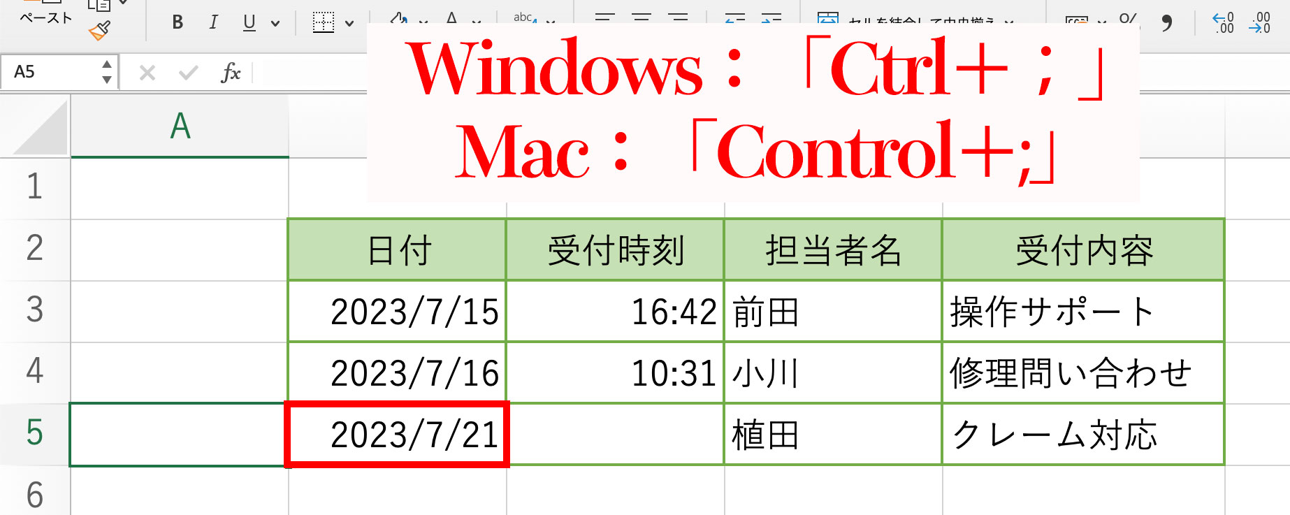 これはその日の日付を入力するショートカットです。キーボードで打っての入力も良いですが、「Ctrl+;」だと一発で出せます。