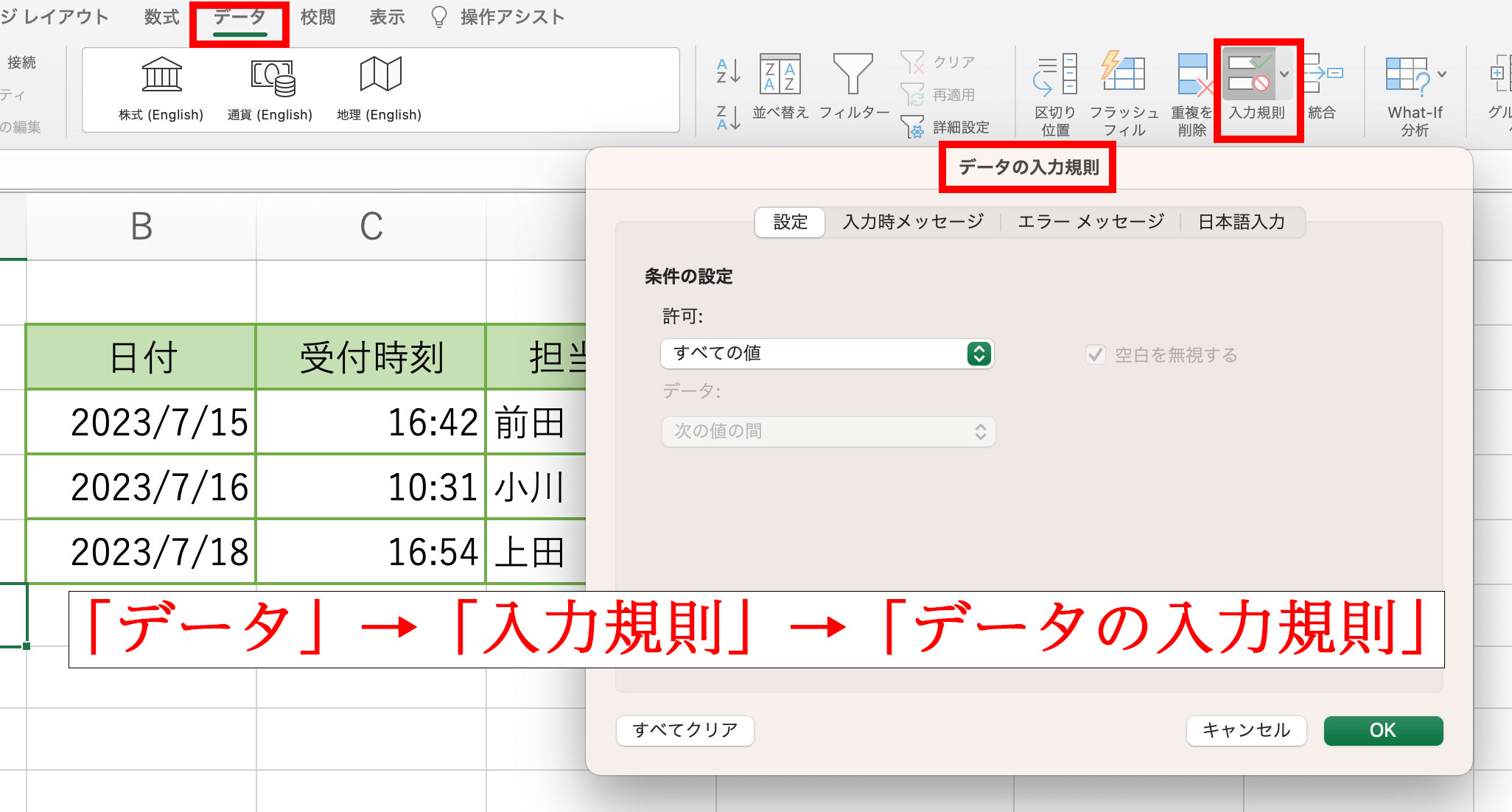 画面上にあるタブで、「データ」をクリック。そして「入力規則」をクリックすると、「データの入力規則」の画面が出てきます。