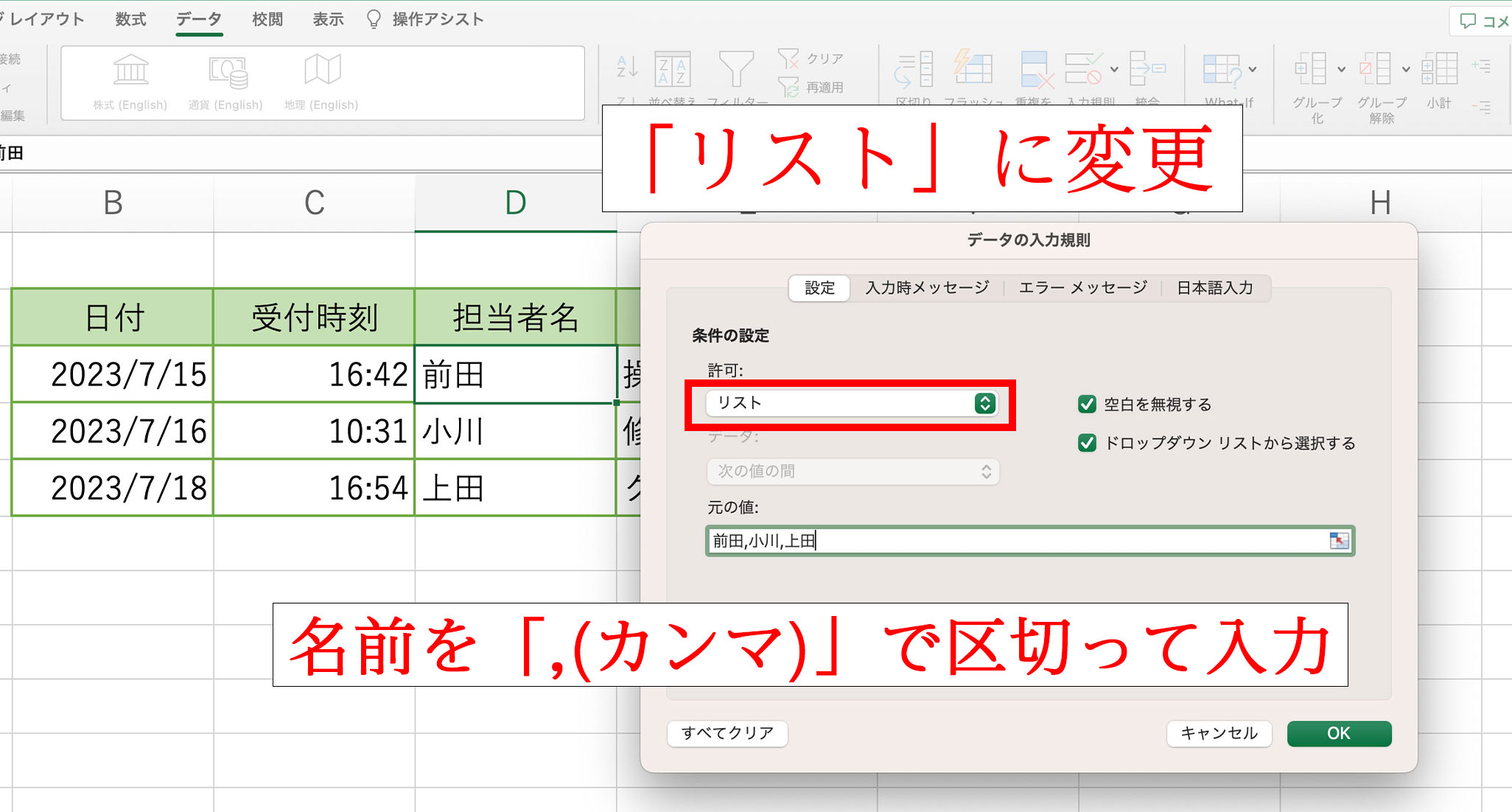次に「すべての値」と表示された箇所を「リスト」に変更。次に「元の値」と表示された箇所に、表で使用する名前を「、(カンマ)」で区切りながら入力していきます。そしてOKをクリック。