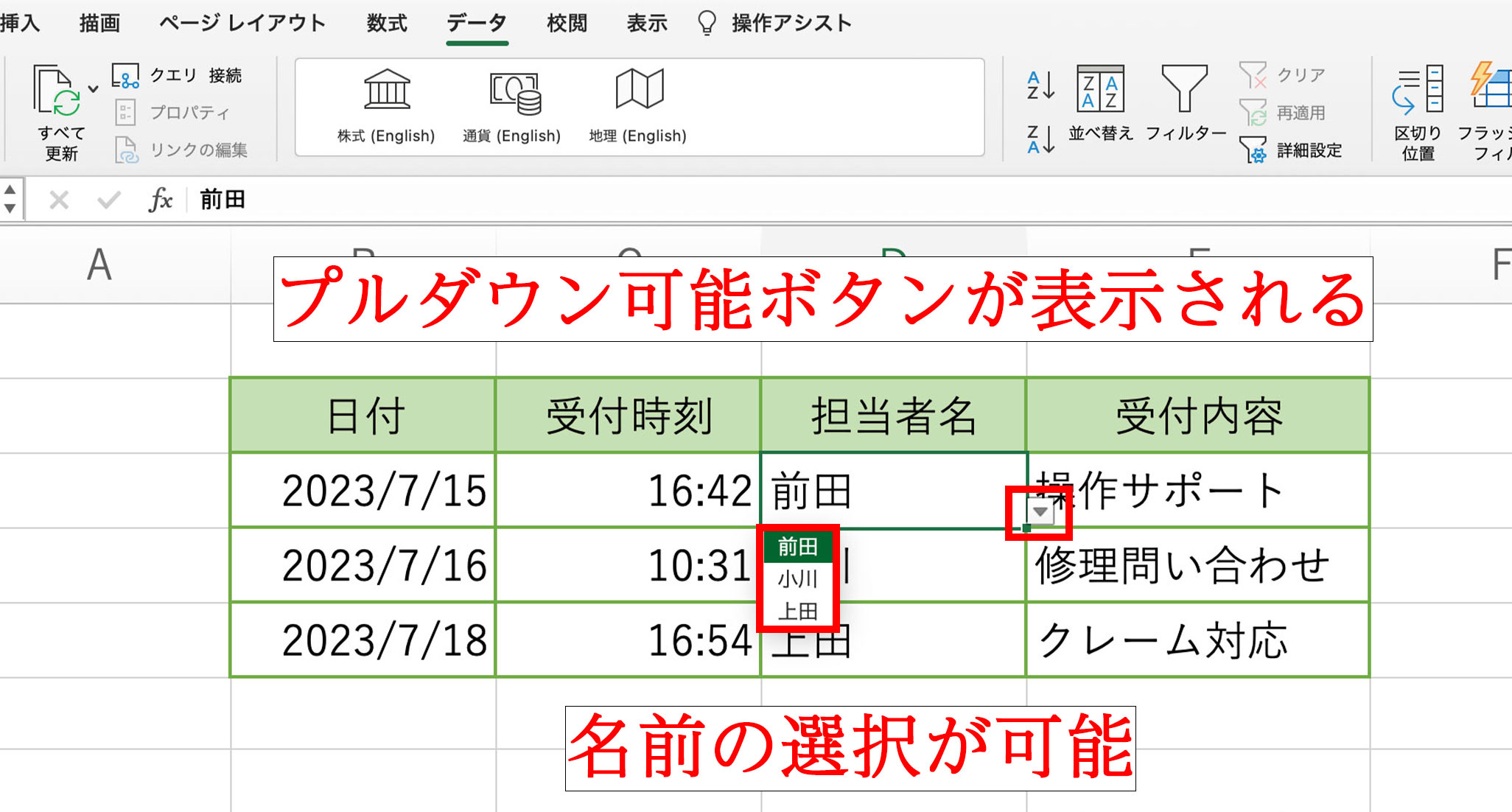 では今回は、この前と同じワークシートを使います。こういった表はよく見かけますが、担当者の名前を入力する時に「名前の制限」をする事ができます。